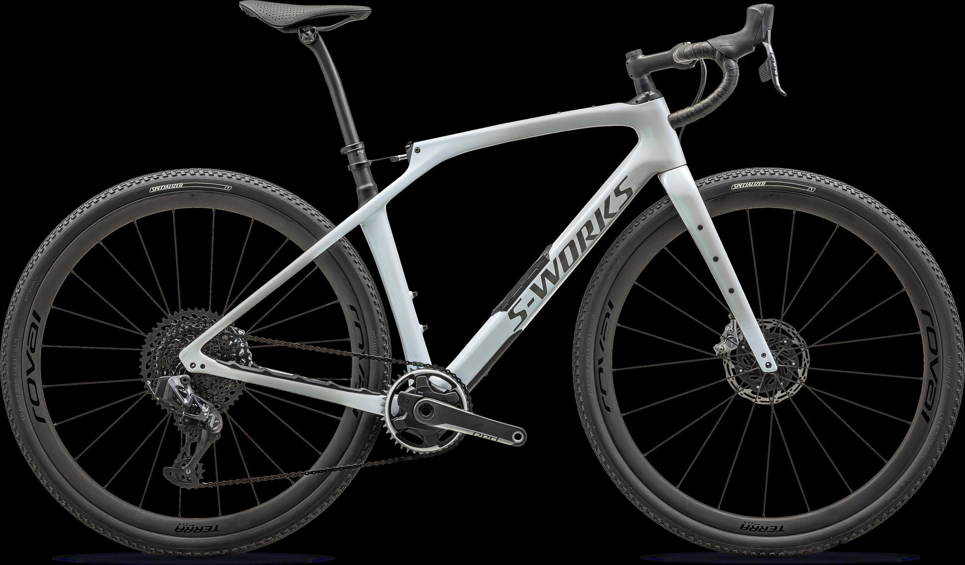"S-Works Diverge STRWith Future Shock suspension front and rear, the new Diverge STR delivers compliance without compromise. By suspending the rider—instead of the bike—Future Shock technology increases control and efficiency while decreasing fatigue, so you’ll be riding farther and faster over chunkier terrain than you believed possible. And the Diverge STR does this without the weight, sluggish pedal response, and inefficiency of other suspension systems. The S-Works Diverge STR starts with our FACT 11r carbon frameset with front and rear Future Shock suspension. It’s built with SRAM’s Red eTap AXS Eagle groupset for fast, efficient shifting with a 10-50 cassette to ensure you have the gearing to tackle any ride and a Quarq power meter helps you to dose your effort to perfection. The bike rolls on the new, lighter Roval Terra CLX II wheels with 42mm Tracer Pro tires. Terra carbon bars, an S-Works carbon seatpost, and S-Works Power with Mirror saddle complete the package making the Diverge STR the most capable Diverge ever.By suspending the rider with damped, tunable travel—20mm front/30mm rear—Future Shock Technology absorbs bump forces to boost your control and capability while retaining the efficiency and responsiveness of a rigid frame. Because as far as power transfer goes, it is a rigid frame. Power to the pedals makes the bike jump like a scared cat. You’re efficient, you’re comfortable, you’re in control. Your bike is light, nimble, and responsive.The new Diverge doesn’t just have gorgeous lines, it has perfect curves too. Future Shock Rear puts 30mm of rear travel in the ideal path to smooth out rough road. Its hydraulic damping controls travel to eliminate “bobbing” under power and ensure big hits never catapult you from the saddle, all without compromising fit or pedaling efficiency.Born from decades of innovation and our Smoother is Faster philosophy, Future Shock was created to develop bikes that win on cobblestones, but it’s found its purest expression on gravel. It’s 20mm of adjustable, damped front travel that keeps you in control and on target, all while protecting your hands, arms, and shoulders from the battering.More capability means more confidence, more confidence means more rides, more rides mean more fun, and it all starts at the contact patch. Nothing unlocks capability like tire clearance, and we’re feeling generous. 47mm on a 700c wheel and 2.1” on 650B. Diverge STR is the most capable gravel bike we’ve ever made, so it’s the most fun. We did the math.The S-Works Diverge STR FACT 11r carbon frame is more compliant than any drop bar bike we have ever made yet adds just 100 grams compared to the S-Works Diverge frame. Never have so few grams added so much capability. Climb it, race it, or load it down with bags and gear for the long haul—Diverge STR does it all faster and smoother without any excess baggage."